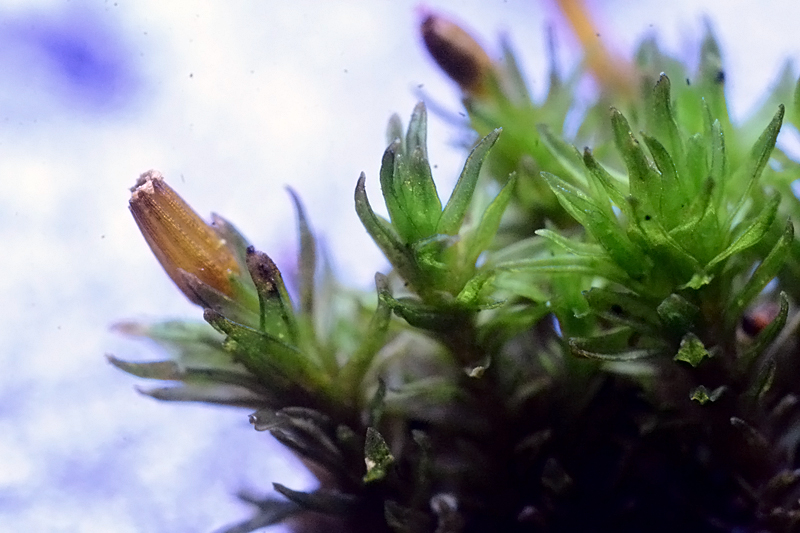 Orthotrichum mosses are best identified when bearing capsules but as an exercise I decided to have a go at this one and see how far it could be narrowed down. Firstly Orthotrichums on trees can be characterised by their recurved leaf margins sometimes the entire length of the leaf. In the photo below you can see that the leaf tips are quite distinctive too beyond the recurved margin and the nerve is protruding which is also visible in the leaf section in the inset. With the specimen below the leaves were wide spreading with the basal quater curving and the remainder straight.